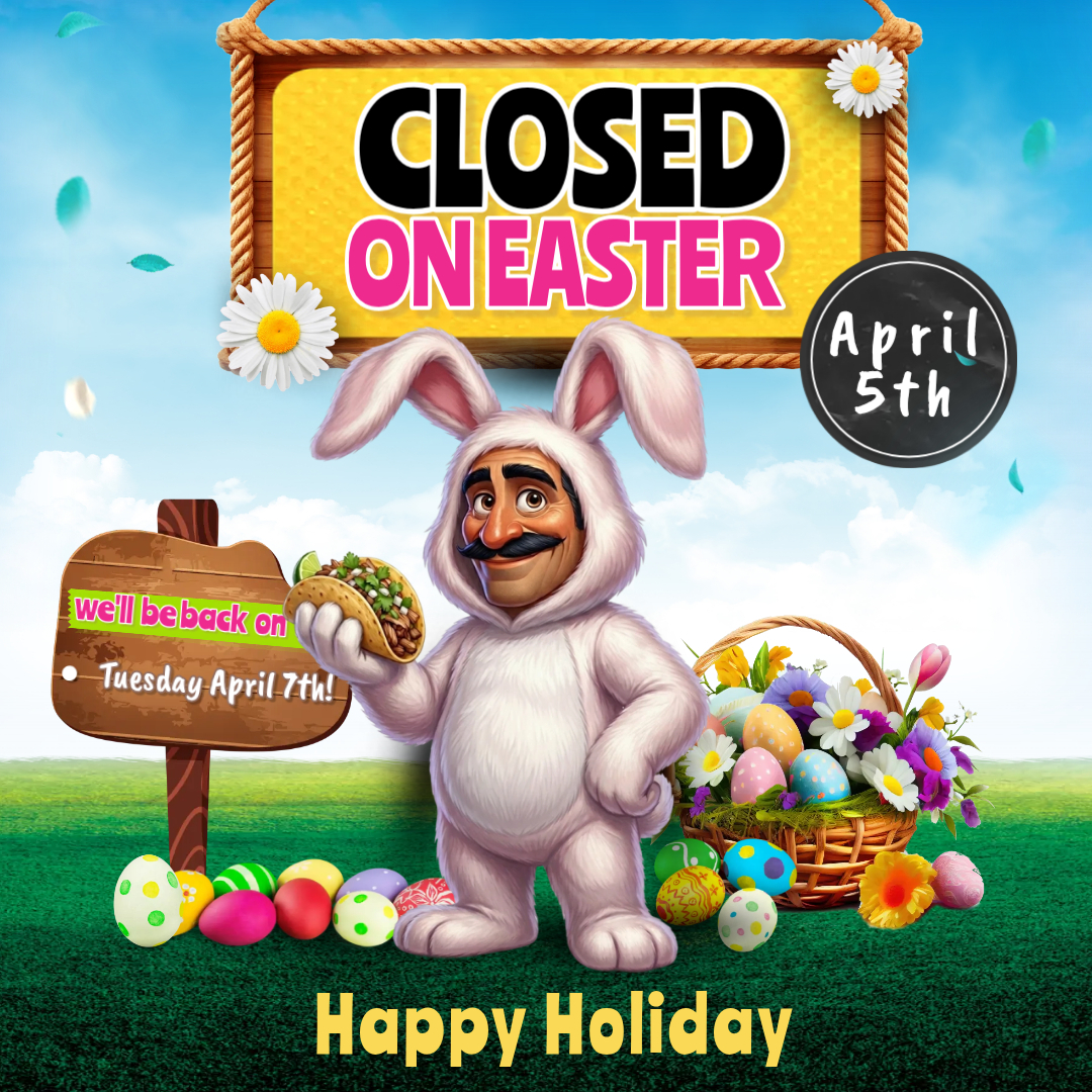 We are taking Sunday off to celebrate Easter with our families. We appreciate your business and can’t wait to see you when we resume normal hours on Tuesday, April 7. Happy Easter!